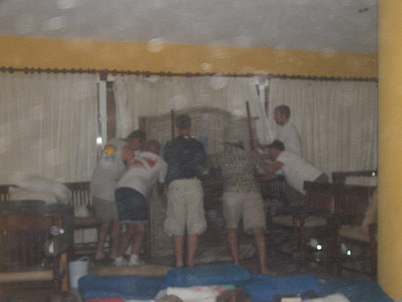 By Saturday afternoon "Wilma" seemed to be moving on. The winds had died down enough for us to start venturing out to our rooms mostly to see what damage had been done. The hotel is a long narrow building. The rooms are accessible by way of open walkways along the back of the building. Each room had a patio door opening out to a balcony on the other side. These faced the ocean. And they all had tile floors. Now we know why. There were only minor problems with most of the rooms. The air conditioners had blown in. They were easily shoved back into place. But the open gaps caused minor flooding. We all took turns squeeging the water out. And a towel around the air units helped keep more of the rain out. There were only a couple of patio windows that actually broke. Mostly the problem was the frames giving way. Our frame was rattling quite a bit. So, Chris "borrowed" one of the pieces of wood used to shade the walkway light outside of our room to brace the door frame against the wooden valance. It worked. We also left the entrance door open to relieve the pressure in the room.
