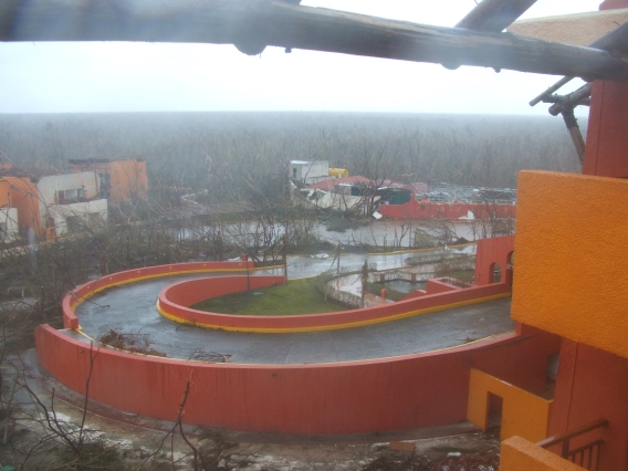 There was one tense moment on the second day when the winds got stronger as the eye approached. It was taking more than just a couple guys to hold the hutch against the doors and more plywood had blown away from another window. While the men tried to do what they could, the women and children were rushed to a lower level. As we descended the stairs, a stream of water was rushing down with us. None of us was too sure this was a good idea. We were taken to the laundry room of the hotel which to our relief was completely dry. The eye wall passed (we actually missed the eye by a few miles), and it was safer for us all to return to the restaurant. All night the wind howled as it had the past 24 hours. Most of us did not sleep even though we were thoroughly exhausted.