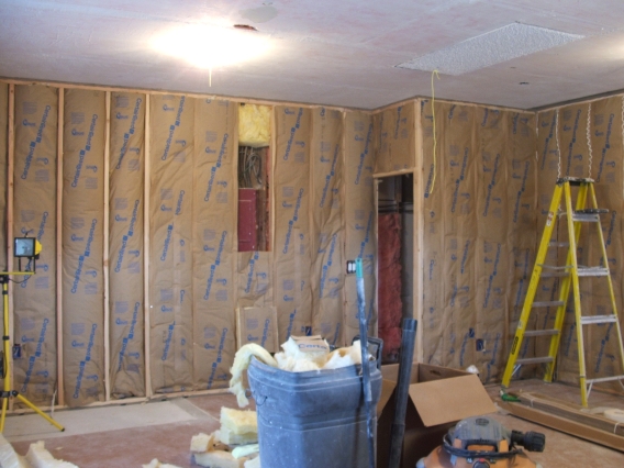 | | After installing the insulation, it was time for the first drywall layer. We chose to hang the first layer horizonally.